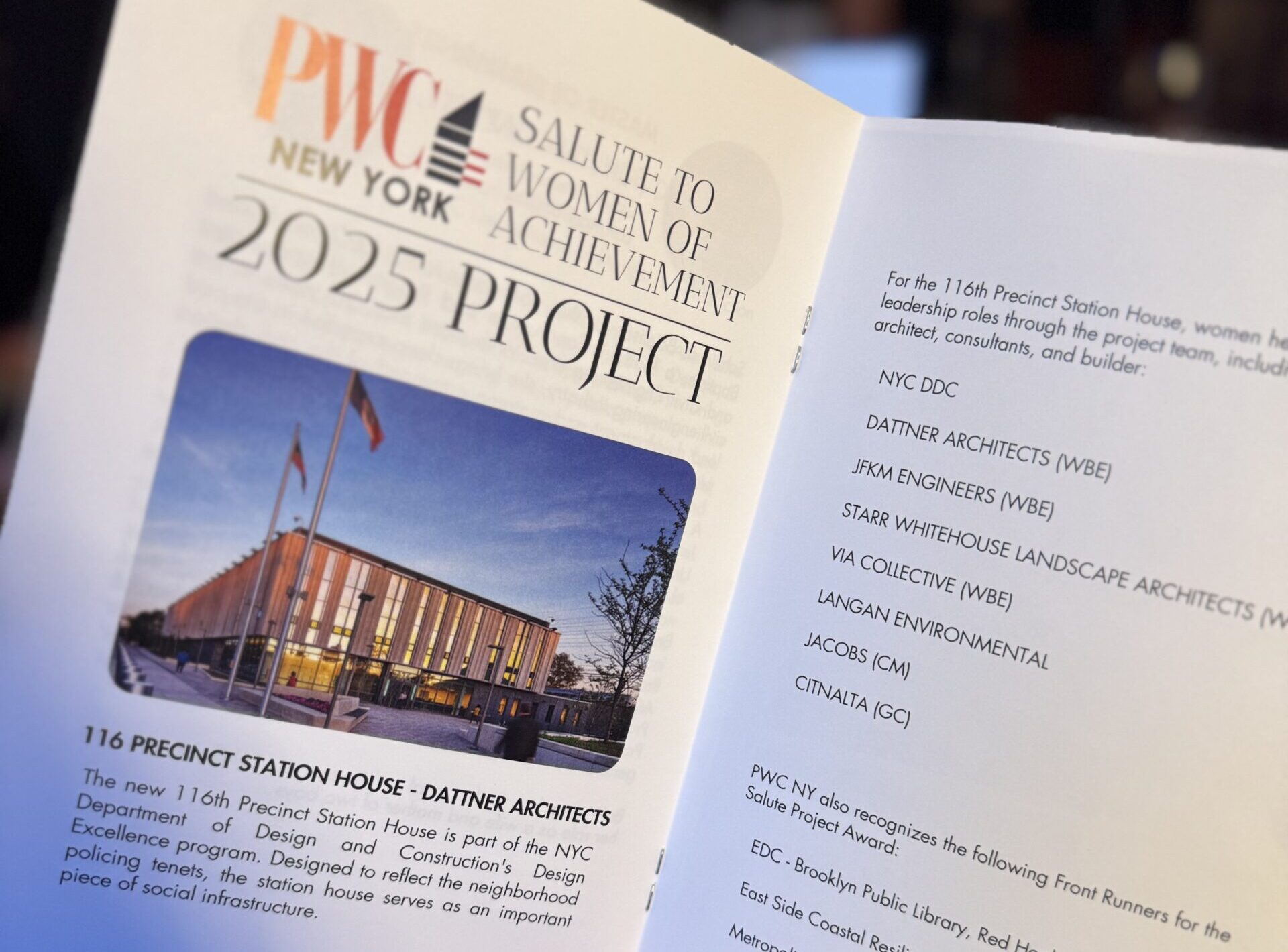 The Professional Women in Construction (PWC) New York Salute to Women of Achievement 2025 Annual Gala was a truly inspiring and joyful celebration of women shaping the future of the AEC industry. Via Collective is proud to have been involved in a key project recognized at the event. A highlight of the evening was the presentation of the Salute Project Award 2025 to the NYPD 116th Precinct. Via Collective contributed to this award-winning project by designing the interior and exterior wayfinding and signage, including identification at key entrances, NYPD-only parking, and interior wayfinding such as room identification, regulatory, and ADA-required signage.