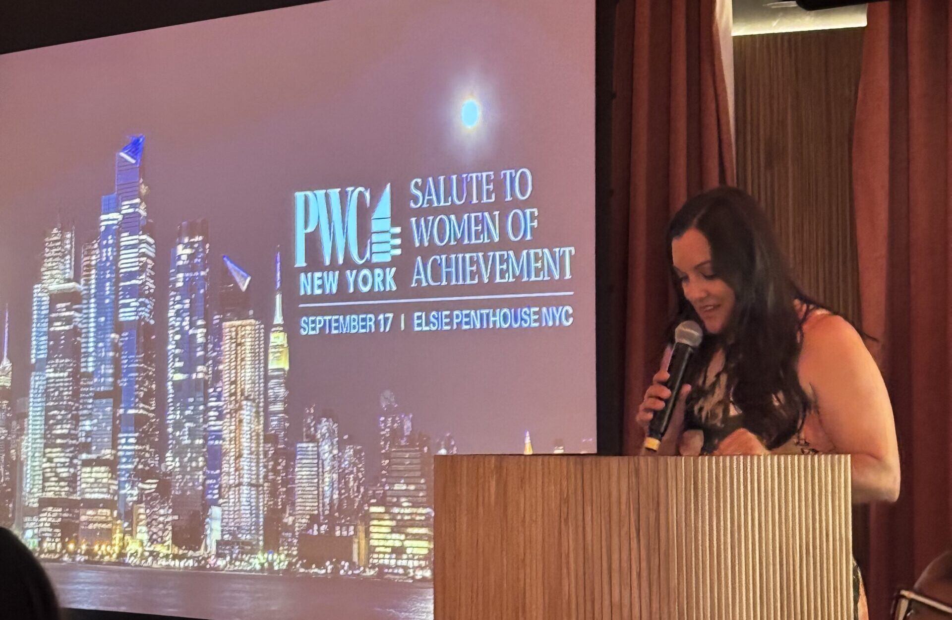 A highlight of the event: Gina Rivera, Executive Director of PWC New York, delivering key insights on advancing women’s success and honoring the distinguished award winners at the Salute to Women of Achievement 2025. Photo Credit: ©️Via Collective